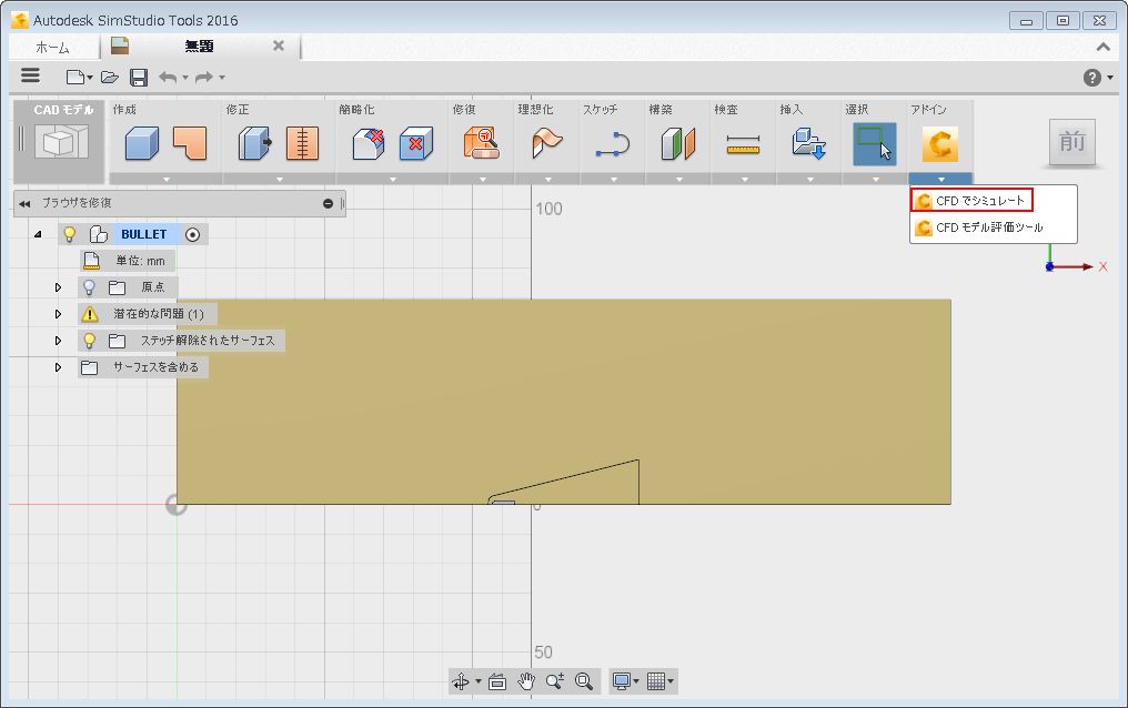 [アドイン]メニューを展開して、[CFD でシミュレートする]を選択します。
