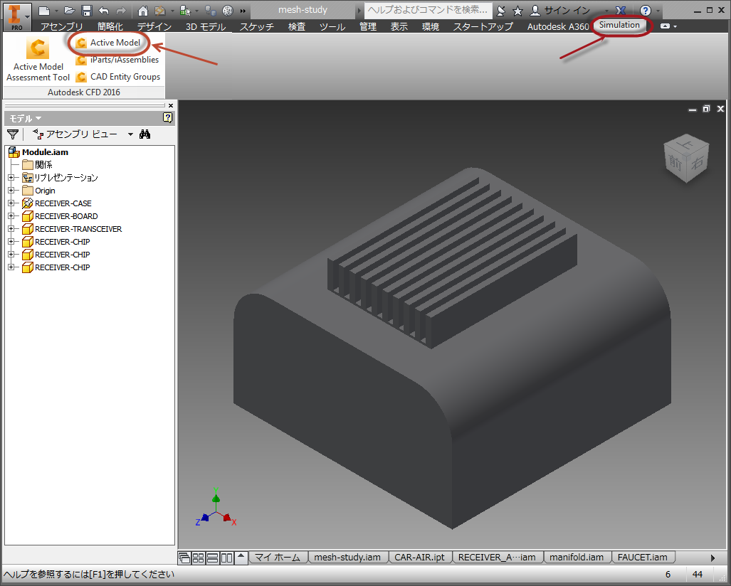 たとえば、Autodesk® Inventor から起動している場合は、[シミュレーション]と[アクティブ モデル] をクリックします。