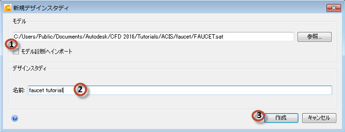 [ファイル マネージャ]ダイアログで、Users¥Public¥Public Documents¥Autodesk¥CFD 2016¥Tutorials¥<ファイル タイプ>¥faucet に移動します。