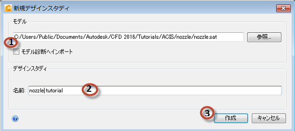 [ファイル マネージャ]ダイアログで、Users¥Public¥Public Documents¥Autodesk¥CFD 2016¥Tutorials¥<ファイル タイプ>¥nozzle に移動します。