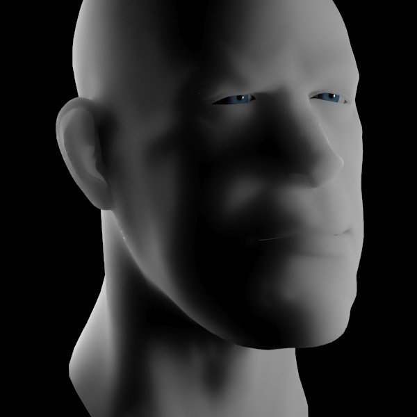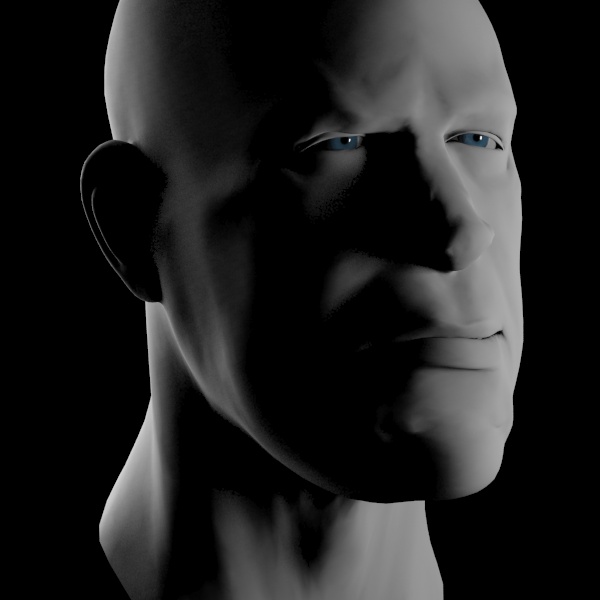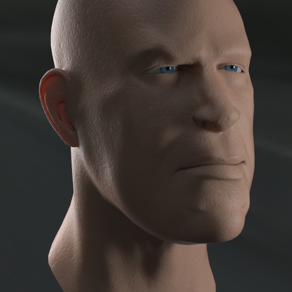シンプルな頭部を使ってまっさらな状態からスタートしましょう。このチュートリアルでは、ポリゴン数が非常に少なく、大部分がフラット カラーで、手続き型テクスチャ以外はテクスチャ マップは使わない頭部モデルを使用します。言うまでもありませんが、実際のプロダクションで真に写真のような結果を得るには、以下に示すほとんどすべてのパラメータにテクスチャが適用されます。しかし、シンプルなフラット カラーでどこまで実現できるか検討してみましょう。これは非常にやりがいがあります。