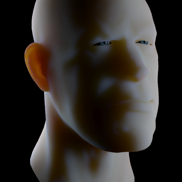 上のイメージは、色成分が異なると、スキャッタリング距離も異なることを明確に示しています。また耳を通過する光線は、厚さに応じて黄色から、オレンジ、さらには赤まで、さまざまなシェードを通過するという点にも注意してください。新しいシェーダでは、これらのエフェクトはすべて自動的に実行されます。古い misss_* シェーダでは、耳を通過するスキャッタリングは赤だけでした。これは分散カラーを使って、この色を赤にしたためです。分散カラーは白のままです。