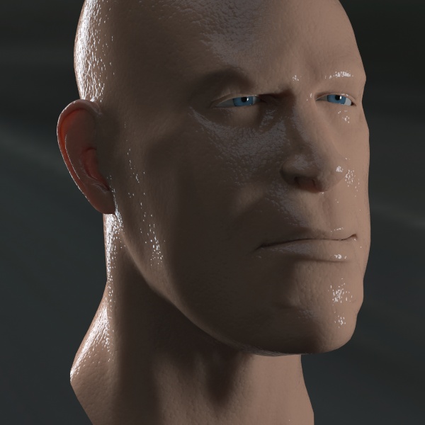 もちろん、上記のレンダリングでは、既定の完全スペキュラ反射レイヤを使用しました。しかし、スキンの反射は非常にぼやけています。反射レイヤの glossiness の値を 0.42 に落とすと、次の結果が得られます。