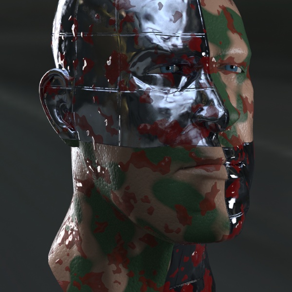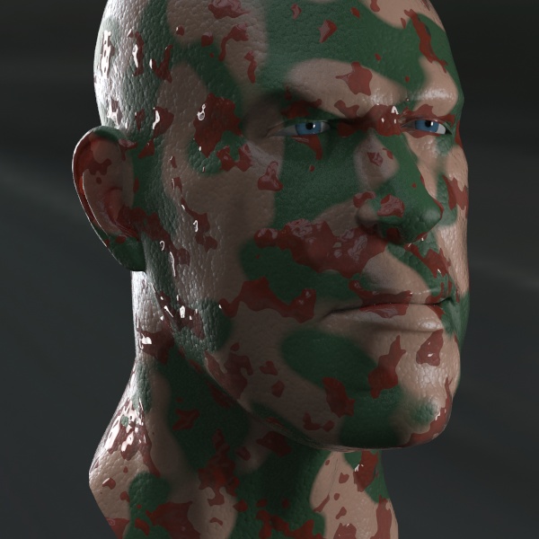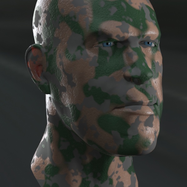 もちろん、このようなパターンとしては、兵士が使用するグリース ペイントが思い浮かびます。そこで、以前と同じバンプとマスクを使って、フレネルによりウェイト付けした、別の光沢反射レイヤをペイントの上に追加します。次のような結果が得られます。