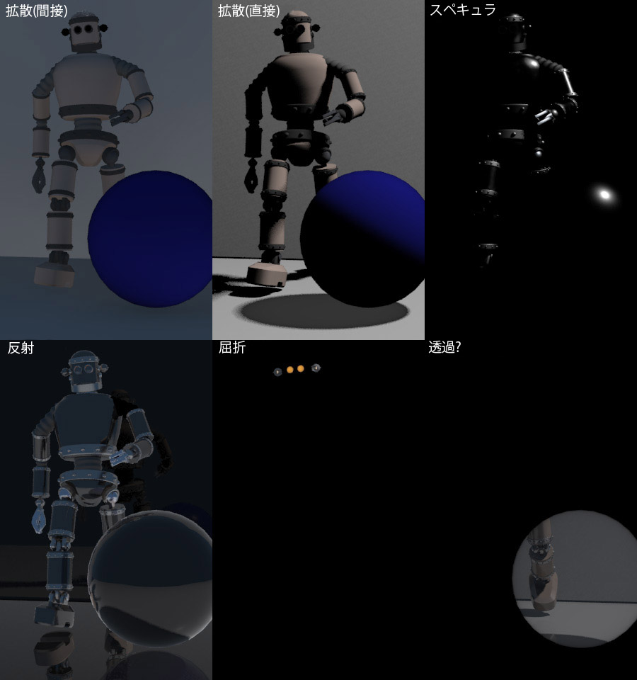 いくつかのレイヤを含むサンプル シーンで、不透明なロボットの手前に単純な透明球体を配置します。この場合、透明は、中空ではないガラスの球体とは反対の概念であり、薄いガラスの球面を表現します。このほうがスペキュラ透過コンポーネントでの実装に適しています。