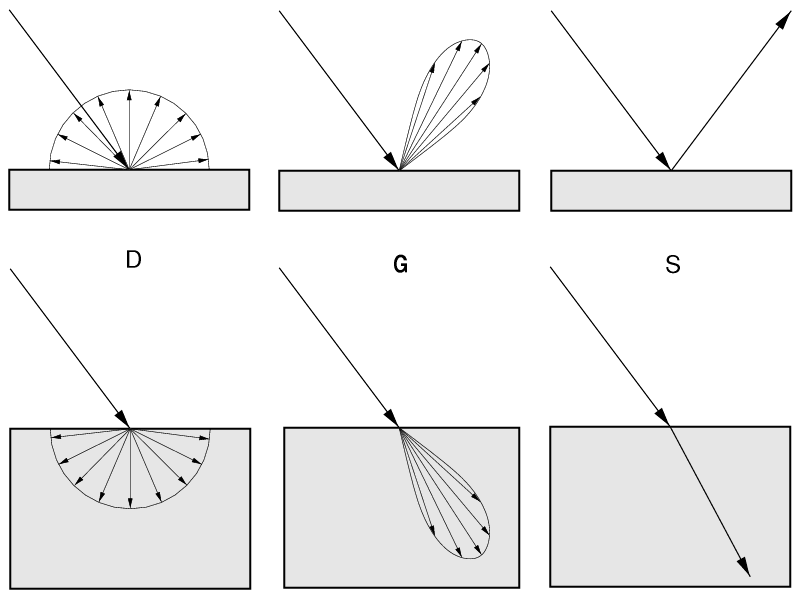 このパッケージに特殊な物理ライトが含まれています。レイヤ化ライブラリでは、要素コンポーネントを組み合わせてマテリアルの品質を決めます。これらの要素コンポーネントは、拡散、光沢、スペキュラ、反射、または透過などの標準的なサーフェイス インタラクションを表現します。マテリアルの説明では、反射や透過を散乱タイプと呼んでいます。透過は光を進行方向に散乱させ、反射は進行と逆の方向に散乱させます。