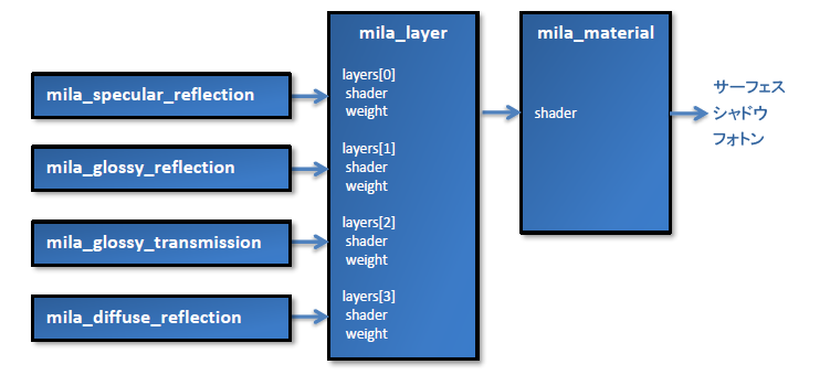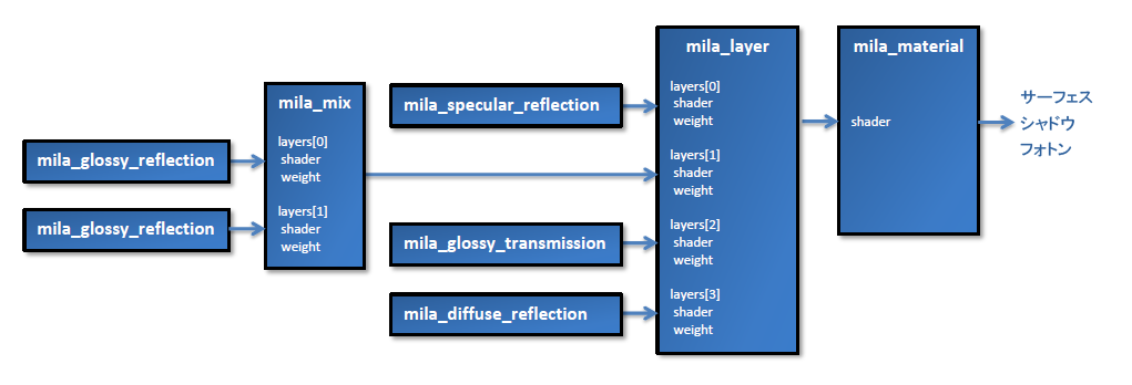 ルート シェーダ mila_material は、"shader" スロットへの入力として単一の mila_layer または mila_mixを必要とし、およびシェーダ ツリーはそこから広がっていきます。