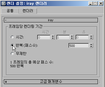 주 iray 렌더러 컨트롤은 렌더링의 기간만 설정합니다. 시간, 분 및 초 단위로 시간을 설정하거나 반복 횟수를 지정하거나 무제한 렌더링을 설정할 수 있습니다. 무제한 옵션은 야간 렌더링에 적합합니다.