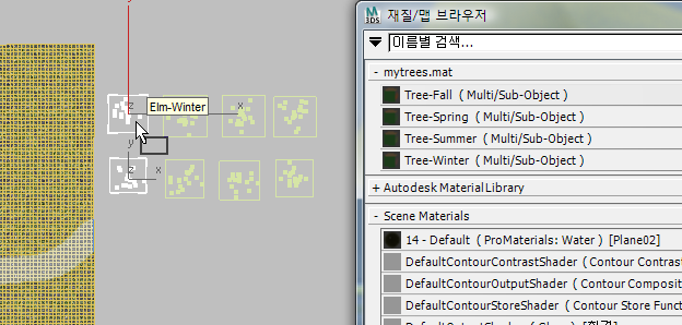 mytrees.mat 그룹에서 나무-겨울 재질을 드래그하여 선택 영역에 드롭합니다.