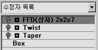 수정 패널의 수정자 스택에서 각 수정자 왼쪽에 있는