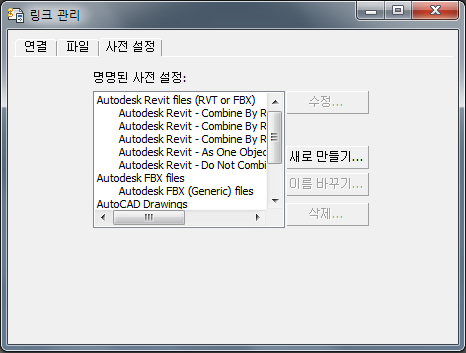 사전 설정 탭에는 RVT, FBX 또는 DWG 파일을 링크하는 여러 가지 사전 설정이 나열됩니다. 주 연결 탭의 사전 설정 드롭다운 리스트에서 사전 설정을 선택할 수 있습니다. 사전 설정 탭을 사용하여 사전 설정을 편집하거나 새 사전 설정을 추가합니다.