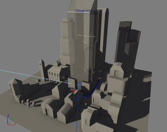 장면은 중심에 고층 건물이 있는 도시 블록으로 구성되어 있습니다. 또한 일광 시스템이 포함되어 있습니다. 이 시스템은 캘리포니아 샌프란시스코 위도에 장면을 배치하도록 설정되어 있으며, 태양 위치는 겨울철 새벽 무렵인 0700시로 설정되어 있습니다.