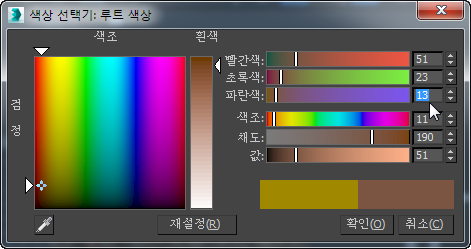 2. 머리카락의 루트 색상을 R=11, G=5, B=2로 변경한 다음 확인을 클릭합니다.