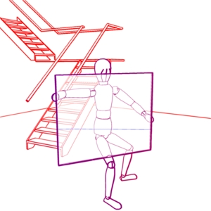 다음 그림에서는 캐릭터가 잡고 있는 창유리를 가로지르는 파란색 선을 보여줍니다. 이 파란색 선은 카메라 뒤에 있는 바닥의 가장자리가 반사된 것입니다.