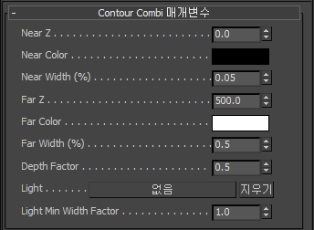 윤곽 두께를 결정하는 데 사용할 장면 라이트를 지정하려면 이 버튼을 클릭한 다음 라이트를 선택합니다. 라이트를 지정하면 해당 이름이 버튼에 나타납니다.