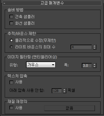 고급 매개변수 롤아웃에는 iray 렌더러의 보다 특수한 목적의 제어가 포함되어 있습니다.