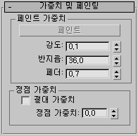 페인트 가중치 컨트롤은 조정 가능한 반경과 폴오프를 가진 구형 브러시를 사용하여 뷰포트의 정점 무게를 변경할 수 있으므로 지연 정도를 제어할 수 있습니다. 정점 가중치 컨트롤은 단일 정점 또는 정점 그룹에 절대 또는 상대적 가중치를 적용할 수 있습니다.