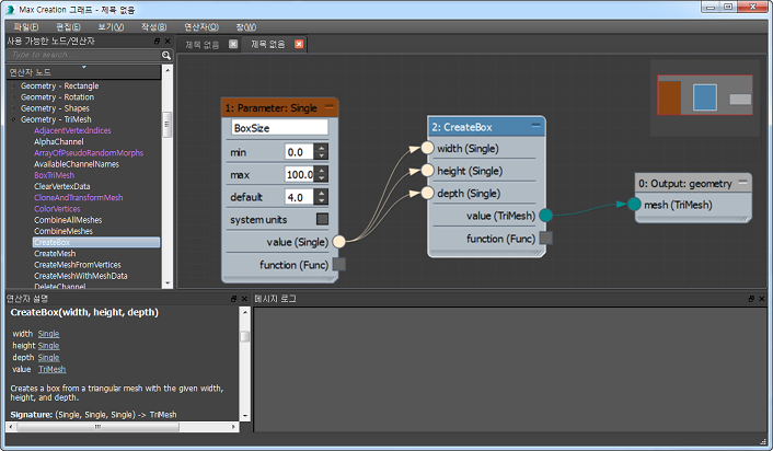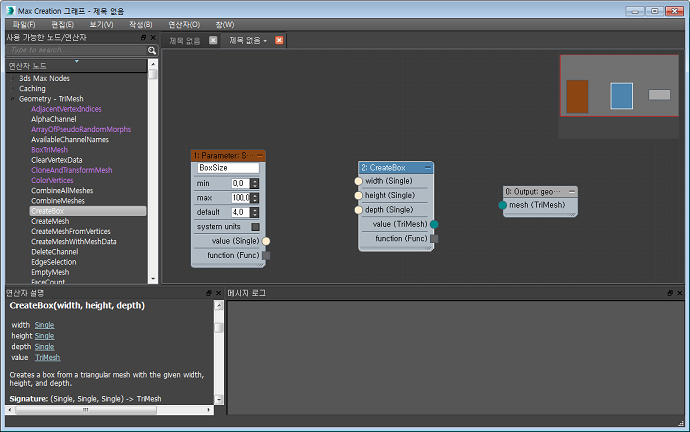 CreateBox 노드는 부동 소수점 값을 입력으로 사용하여 상자 모양의 TriMesh(삼각형 기반 메시) 오브젝트를 출력합니다. 따라서 왼쪽에 상자의 세 치수에 대한 베이지색 입력 커넥터 세 개가 있으며, 오른쪽에 청록색의 단일 출력 커넥터가 있습니다. 매개변수: 단일 노드의 출력 커넥터 색상은 CreateBox의 입력 커넥터 색상과 일치합니다. 이는 커넥터에서 동일한 유형의 데이터를 사용함을 나타냅니다. CreateBox의 출력 커넥터와 출력: 형상 노드의 입력 커넥터도 마찬가지입니다.