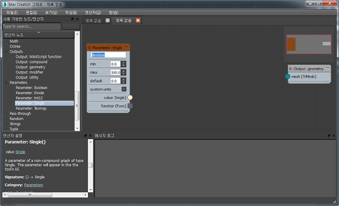 매개변수가 그래프 출력의 인터페이스에 나타나고(이 예의 경우 BoxSize라는 레이블이 있음) 그래프의 사용자가 인터페이스에서 값을 입력할 수 있습니다. 매개변수: 단일 노드를 통해 사용자는 단일 정밀도 부동 소수점 숫자, 즉 소수를 지정할 수 있습니다. 또한 그래프 설계자는 특정 값 범위로 사용자 입력을 제한하고 기본값을 지정할 수 있습니다.
