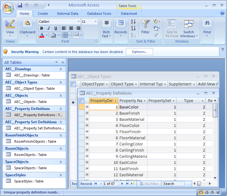 | <Objects> | 하나 이상의 객체에 직접 부착된 특성 데이터를 가진 각 객체 유형의 경우 테이블은 객체 및 연관된 특성 데이터를 포함하여 작성됩니다. 예를 들어, 내보낸 도면이 프레임 깊이 및 프레임 폭에 대한 특성이 부착된 많은 문을 포함하는 경우 DoorObjects 테이블은 모든 문과 프레임 깊이 및 프레임 폭이 나열되어 작성됩니다. |