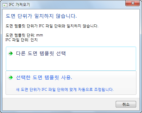 선택하는 템플릿(DWT 파일)에 가져오는 IFC 파일과 동일한 단위가 없는 경우 계속해서 해당 템플릿을 사용하거나 다른 템플릿을 선택할 수 있습니다. 선택한 템플릿을 계속 사용하는 경우 템플릿 파일의 단위가 IFC 파일의 단위로 재지정됩니다.