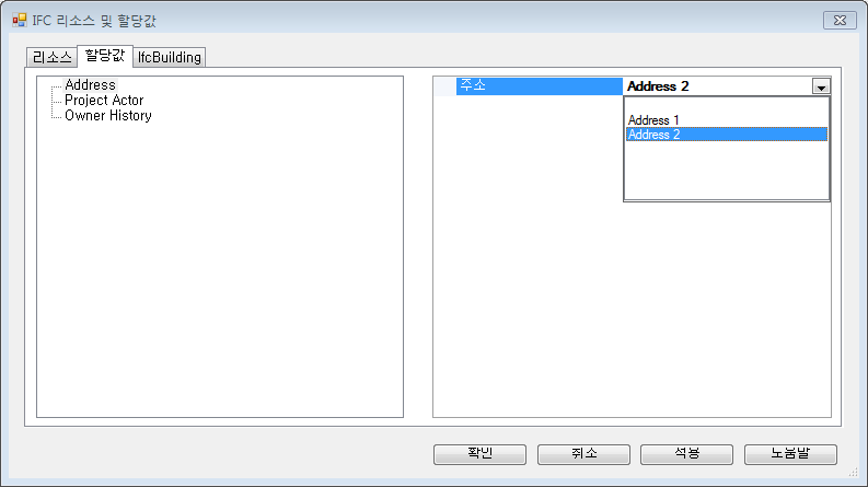 오른쪽 창에서 선택한 IFC 도면요소에 대해 하나 이상의 리소스를 선택합니다.
