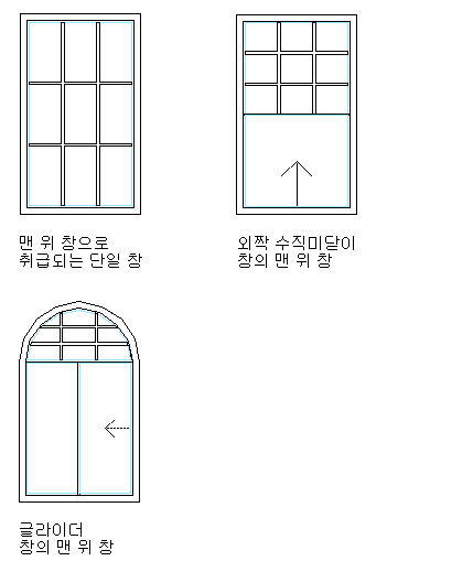 | 상위 새시에만 문살 부착 | 창에서 맨 위를 선택합니다. 맨 위도 단일 새시에 적용됩니다. |