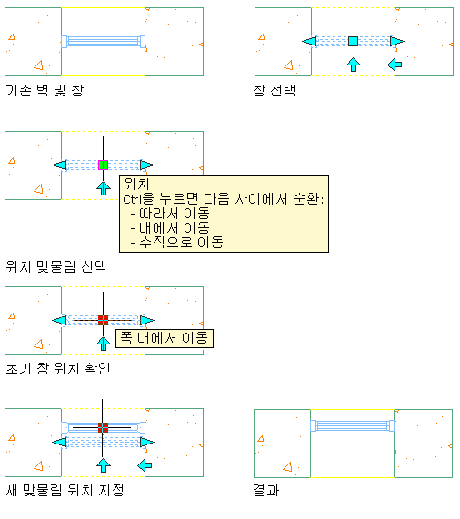 다음 절차에 따라 창을 참조 위치로부터 간격띄우기하여 벽 내에서 하나 이상의 창을 이동합니다.