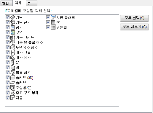 - 객체 탭을 클릭하고 IFC 파일에 포함할 객체를 선택합니다.