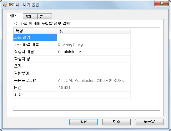 화면에서 활성화된 도면의 이름이 IFC 내보내기 옵션 대화상자의 헤더 탭에 표시됩니다. 도면에 대한 설명, 작성자 및 회사 이름, 권한부여 데이터, 건물의 지리적 위치와 같이 내보낼 도면 파일에 대한 정보를 추가할 수 있습니다. 예를 들어 헤더 탭에 구조 도면에 대한 설명을 Structure for Commercial Building 152로 입력할 수 있습니다. 이 정보는 IFC 파일을 볼 때 파일의 헤더에 표시됩니다.