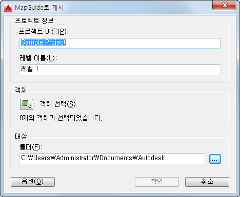 객체를 게시할 도면이 건물 프로젝트의 일부일 경우 프로젝트 이름 및 도면의 레벨 지정이 MapGuide로 게시 대화상자에 표시됩니다.