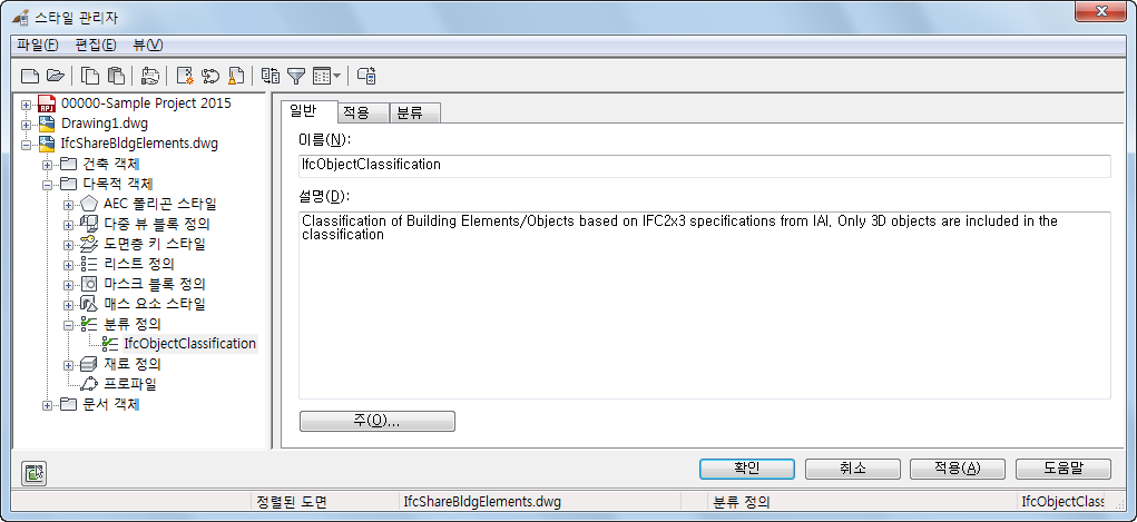 이 도면을 IFC 파일 형식으로 내보내면 분류 정의도 내보내집니다. 도면을 가져올 때 분류 정의가 객체 유형에 부착됩니다.