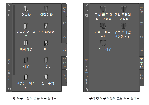 | CAD 관리자에 의해 작성된 사용자 도구 팔레트 | 프로젝트 또는 사무실 표준에 대해 사용자화된 창 스타일 및 특성을 가진 창 도구 |