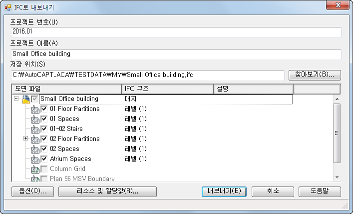 다음 과정에 따라 도면을 IFC 파일로 내보내고 선택한 외부 참조를 포함시키십시오. 내보낼 도면이 도면 화면에 활성화되어 있어야 합니다. 이 도면은 기본적으로 (Ifc)Site에 매핑됩니다.
