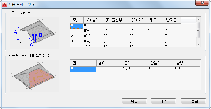 | 선택된 모서리에 면 추가 | 면 열의 마지막 숫자 아래의 공백을 클릭한 후 높이 및 물매에 값을 입력합니다. |