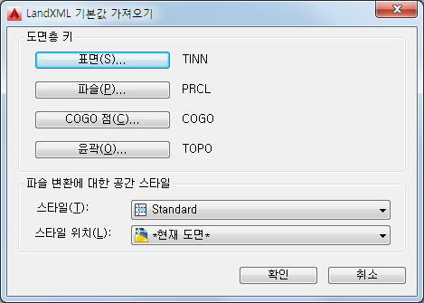 LandXML 파슬을 공간으로 가져오는 경우 필요에 따라 공간 스타일 및 스타일 위치를 선택합니다.