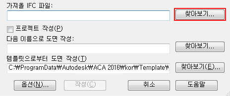 IFC 파일 가져오기 및 도면 작성 대화상자의 가져올 IFC 파일에서 찾아보기를 클릭합니다.
