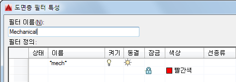 도면층 이름을 입력하거나, 표준 와일드카드 문자를 사용하여 도면층 부분 이름을 입력합니다. 예들 들면, *mech*를 입력하여 이름에 mech 문자가 있는 모든 도면층을 포함합니다.