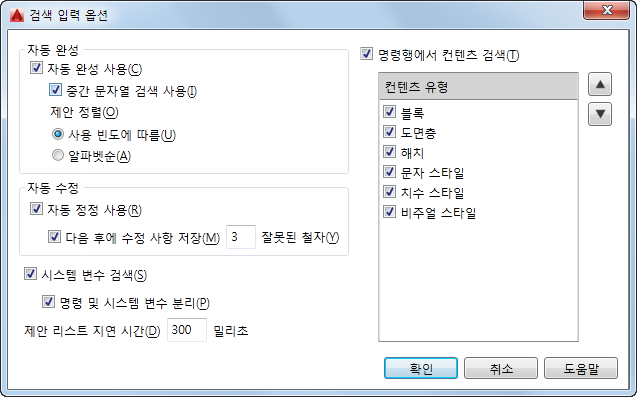 명령, 시스템 변수 및 명명된 컨텐츠(예: 블록 및 도면층)에 대한 명령행 제안 사항 리스트의 표시에 대한 설정을 조정합니다.