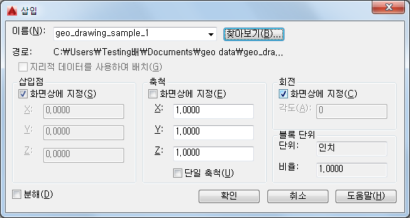 삽입할 블록이나 도면의 이름과 위치를 지정합니다.