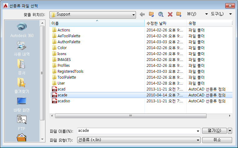 - 선종류 파일 선택 대화상자에서 acade.lin을 선택하고 열기를 클릭합니다.