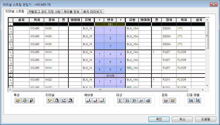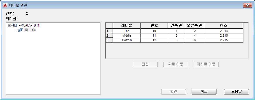 주: 카탈로그 색인을 클릭하여 예비용 터미널 삽입 대화상자에서 예비용 터미널에 대한 카탈로그 정보를 지정할 수도 있습니다. 그런 다음 필요한 경우 카탈로그 검색기 대화상자에서 부품을 선택할 수 있습니다.