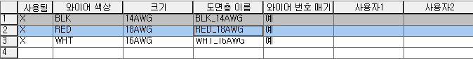 활성 도면에 대해 정의된 모든 유효한 와이어 도면층이 와이어 유형 변경/변환 대화상자에 나열됩니다. 와이어 도면층 이름 및 색상, 크기, 사용자 정의 특성과 같은 와이어 특성이 그리드에 나열됩니다. 사용됨 열의 "X"는 현재 사용 중인 도면층 이름을 나타냅니다.