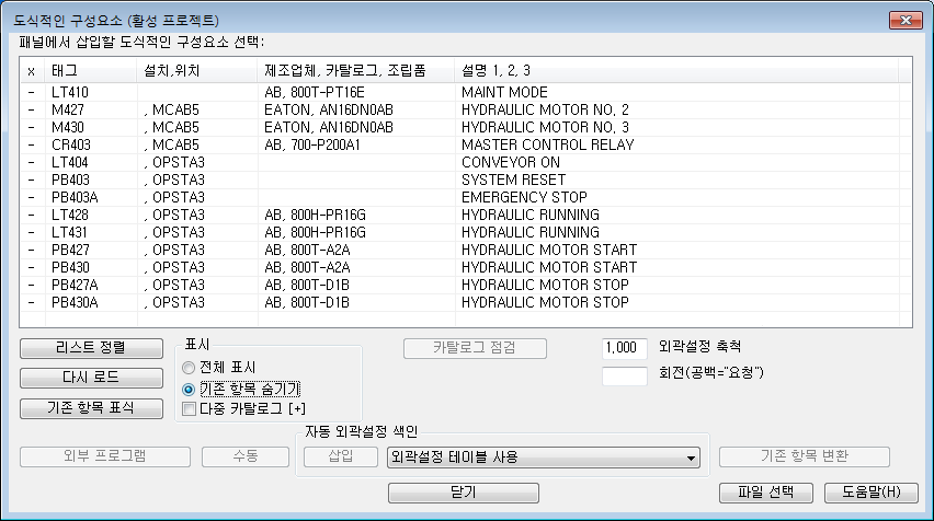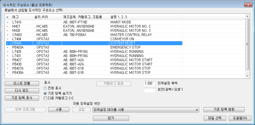 주: 리스트에서 구성요소 옆에 o가 표시되는 경우 구성요소 태그가 일치하는 패널 구성요소를 찾았지만 카탈로그 정보가 일치하지 않음을 표시합니다.