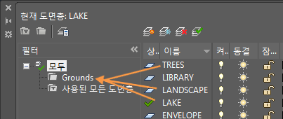 이 예제에서는 '지면'이라는 도면층 그룹 필터를 작성한 다음 TREES, LANDSCAPE 및 LAKE 도면층을 그룹 필터로 끕니다.