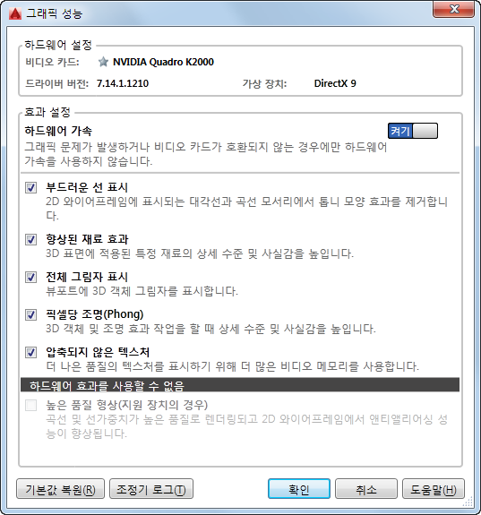 - 하드웨어 가속을 사용하여 현재 드라이버에서 사용할 수 있는 모든 효과 설정을 조정할 수 있습니다. 꺼져 있는 경우 부드러운 선 표시 옵션만 사용하도록 설정됩니다.