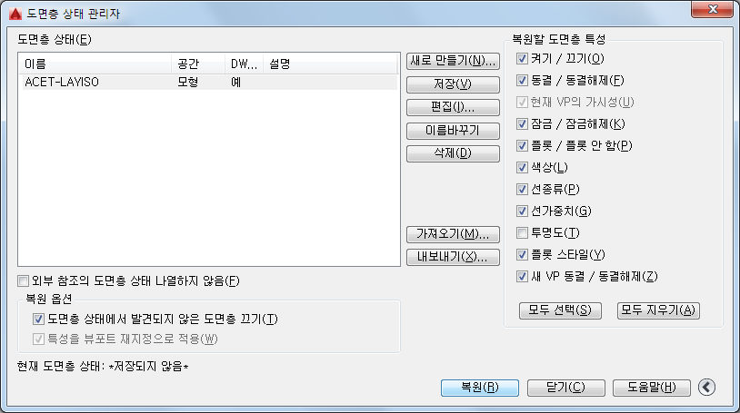 도면층 상태 편집 대화상자를 표시합니다. 여기서 선택한 도면층 상태를 수정할 수 있으며 수정 후 자동으로 저장됩니다.