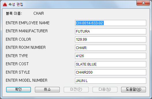 선택한 블록의 이름을 나타냅니다. 블록에 포함된 각 속성의 값이 이 대화상자에 표시됩니다.