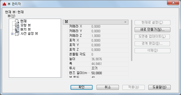 새 뷰/샷 특성 대화상자 또는 새 뷰 대화상자를 표시합니다.