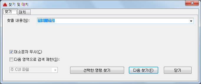 명령 또는 명령 특성(명령 이름, 설명 또는 매크로)을 찾아 대체합니다. 찾기 탭을 사용하여 지정된 문자열의 위치를 찾고, 대치 탭을 사용하여 지정된 문자열을 찾아 대치합니다.